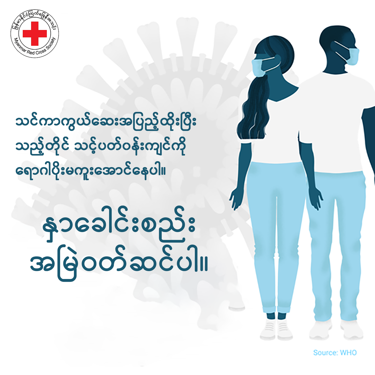 သင်ကာကွယ်ဆေးအပြည့်ထိုးပြီးသည့်တိုင် သင့်ပတ်၀န်းကျင်ကို ရောဂါပိုးမကူးအောင်နေပါ။ နှာခေါင်းစည်း ဝတ်ဆင်ပြီး မကြာခဏ လက်ဆေးပါ။