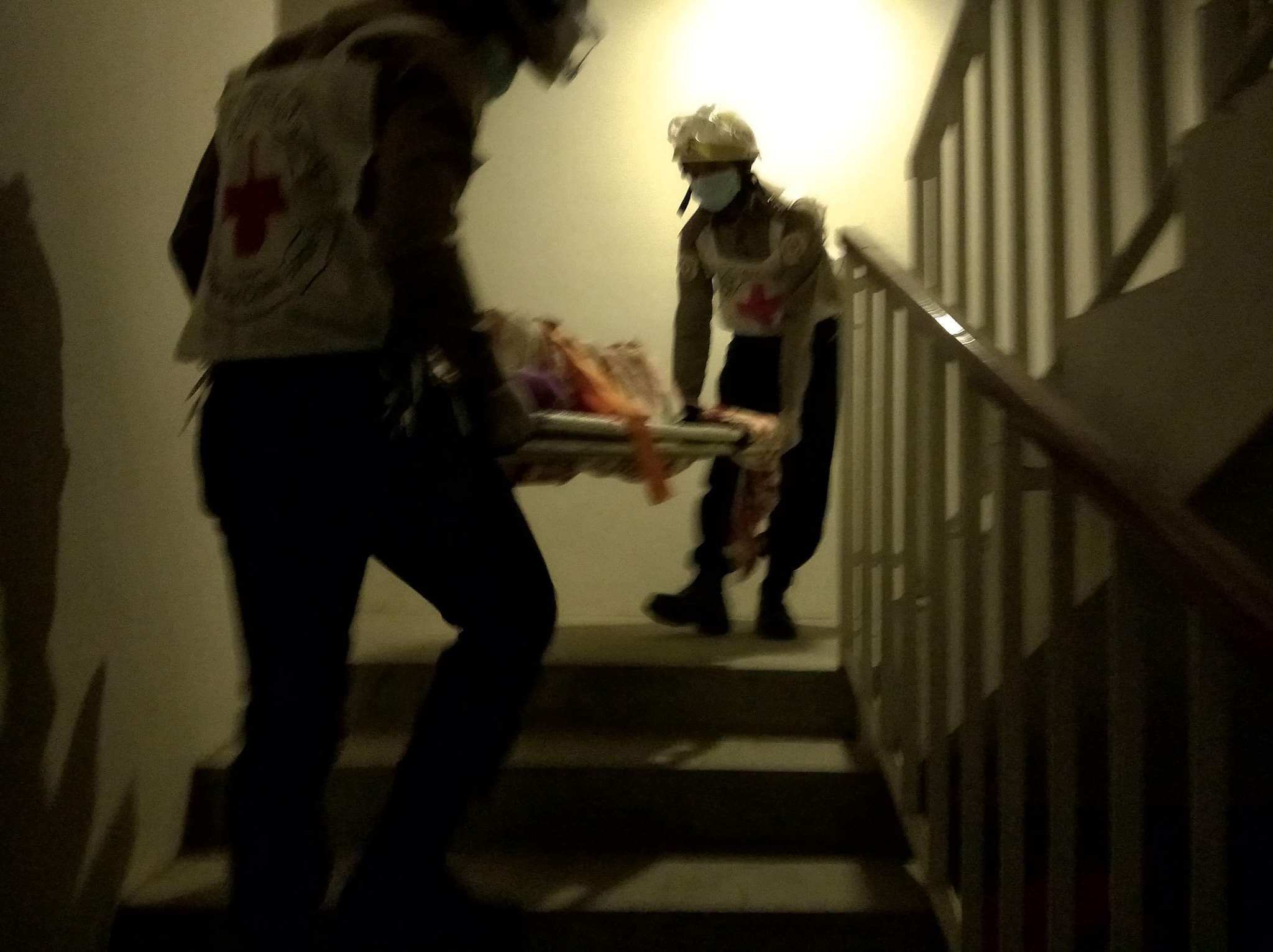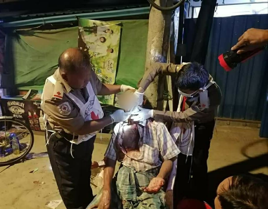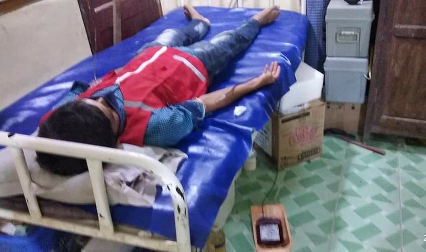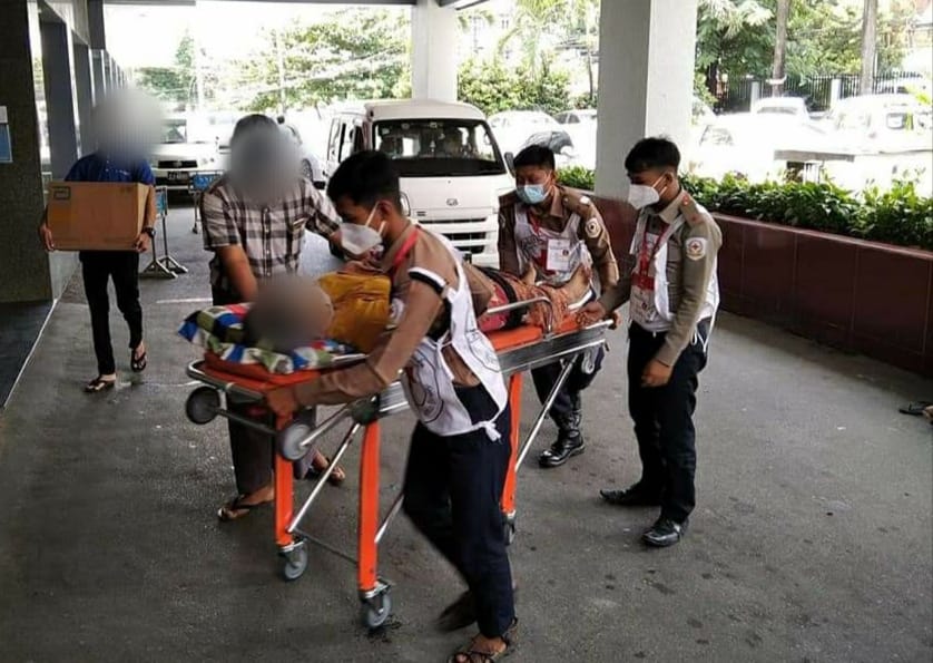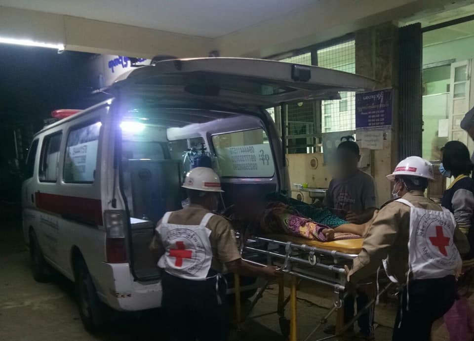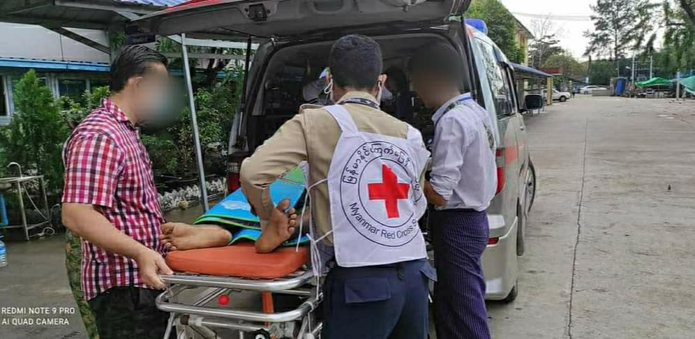 အရိုးကျိုးလူနာအား ကြက်ခြေနီအသင်းခွဲမှလူနာတင်ယာဉ်ဖြင့် ဆေးရုံသို့ ကူညီပို့ဆောင်