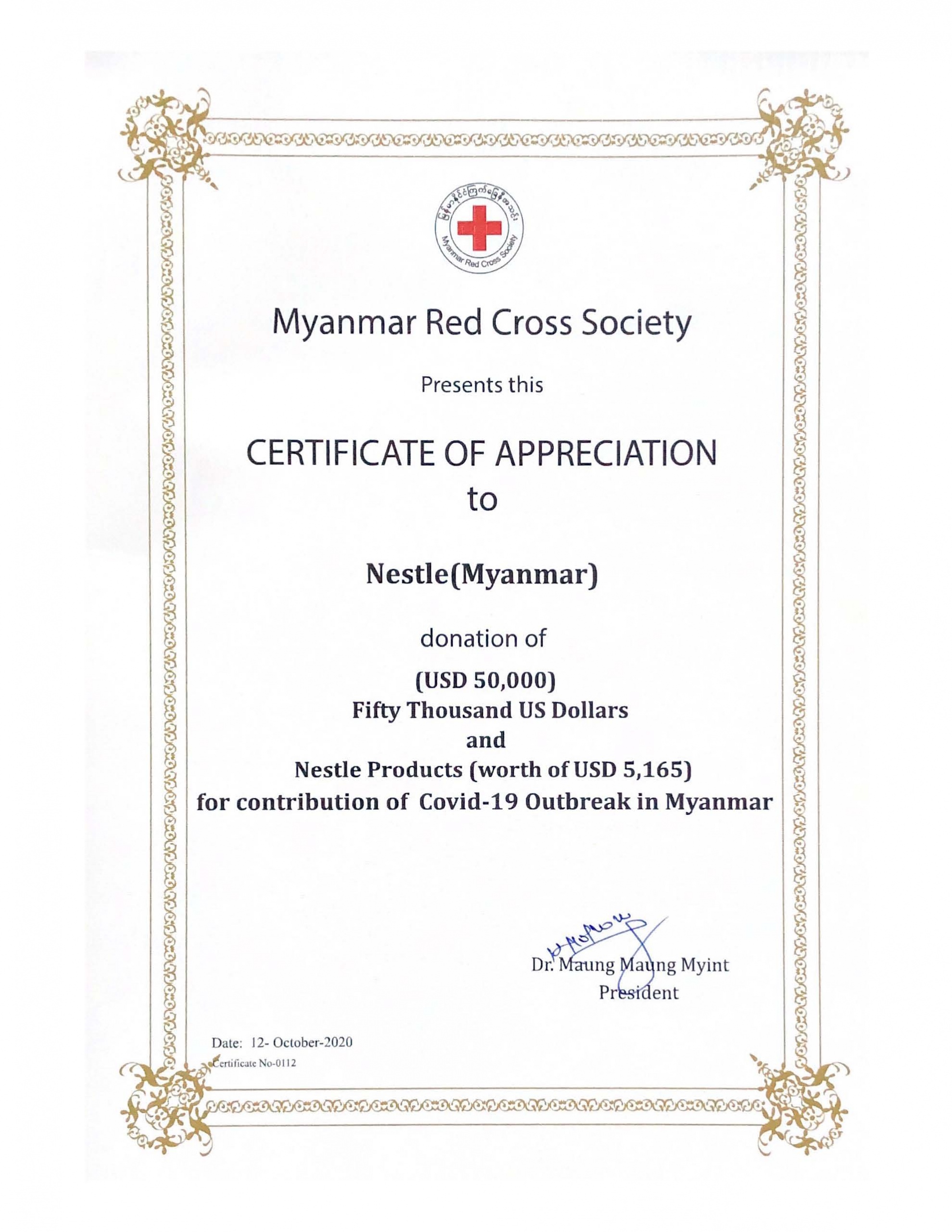 COVID-19 ရောဂါကာကွယ်ရေးလုပ်ငန်းများတွင်အသုံးပြုရန်အတွက် မြန်မာနိုင်ငံကြက်ခြေနီအသင်းသို့ Nestle Myanmar က ထပ်မံ လှူဒါန်း