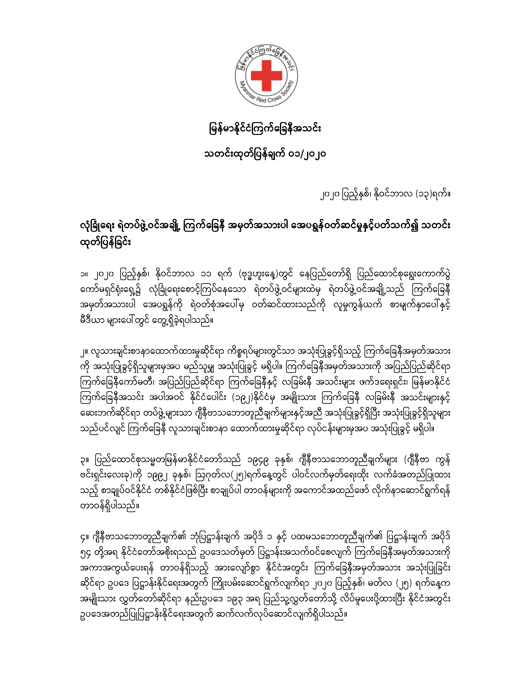 လုံခြုံရေး ရဲတပ်ဖွဲ့ဝင်အချို့ ကြက်ခြေနီ အမှတ်အသားပါ အေပရွန်ဝတ်ဆင်မှုနှင့်ပတ်သက်၍ သတင်း ထုတ်ပြန်ခြင်း (သတင်းထုတ်ပြန်ချက် ၀၁/၂၀၂၀)
