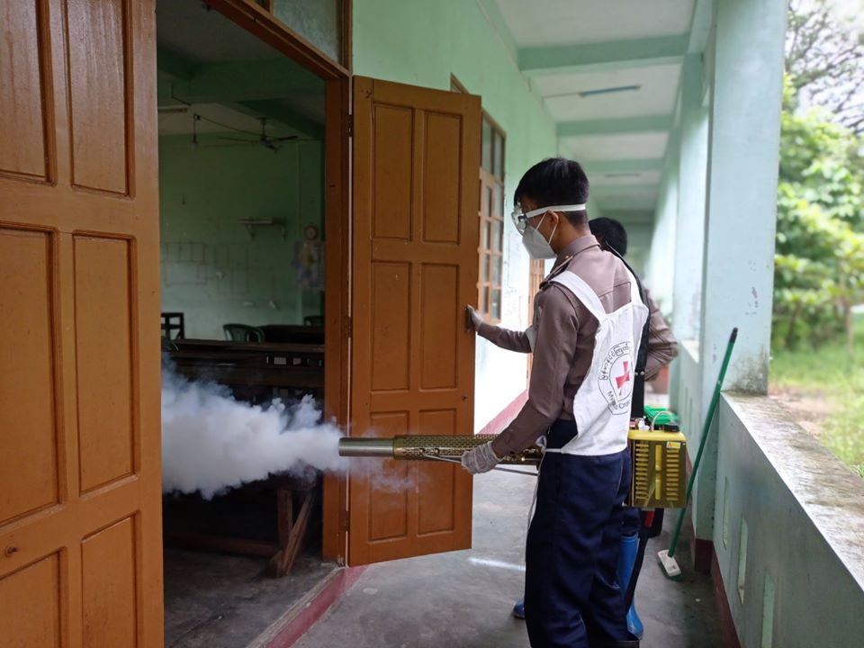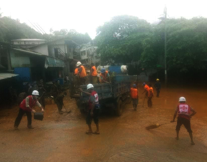 ဖားကန့်တွင် ရေလွမ်းမိုးမှုကြောင့် ရွှံ့နွံအမှိုက်များ တင်ကျန်နေသော ရပ်ကွက်များနှင့်လမ်းများတွင် ကြက်ခြေနီမှ သန့်ရှင်းရေး လုပ်ငန်းများ ကူညီ ဆောင်ရွက်